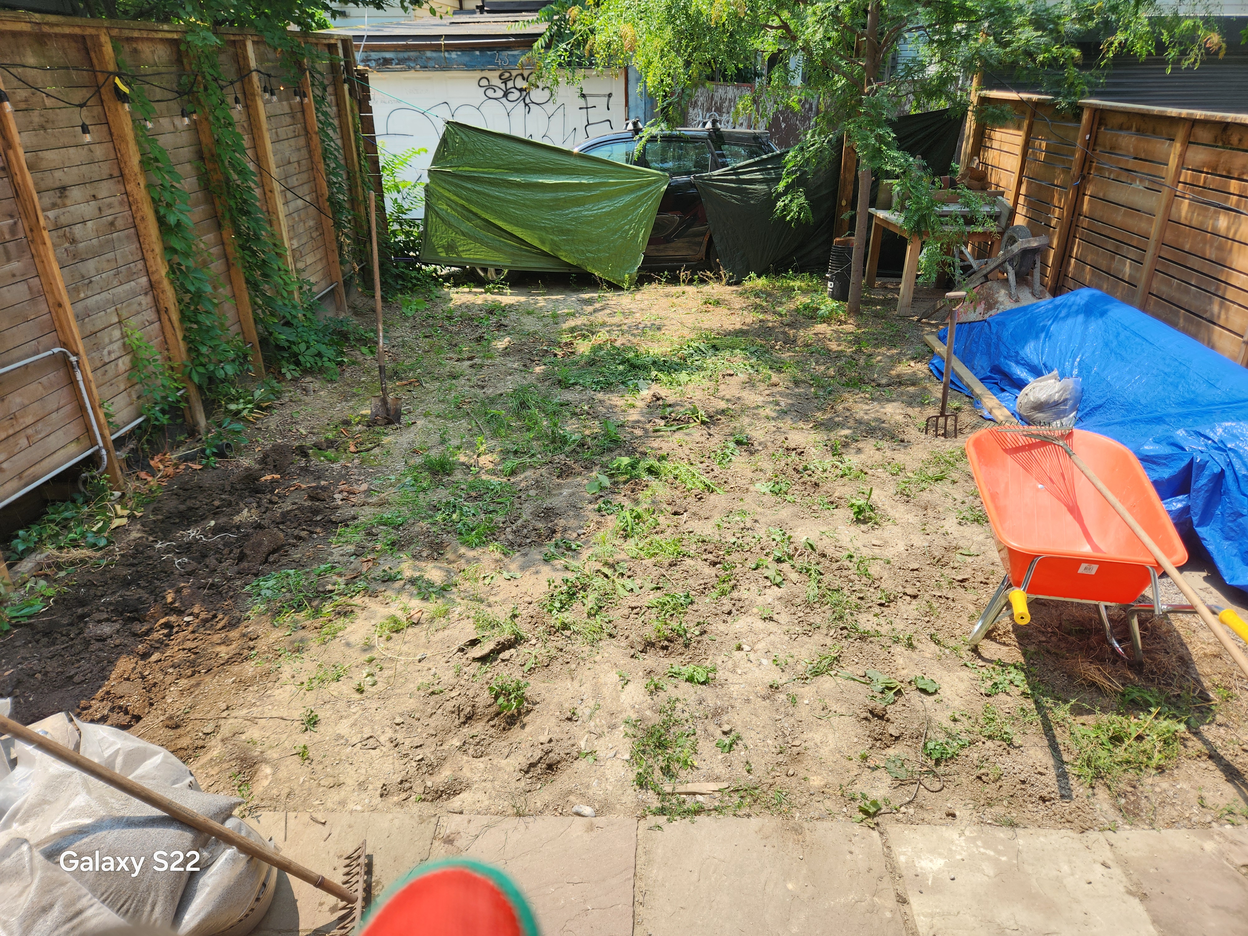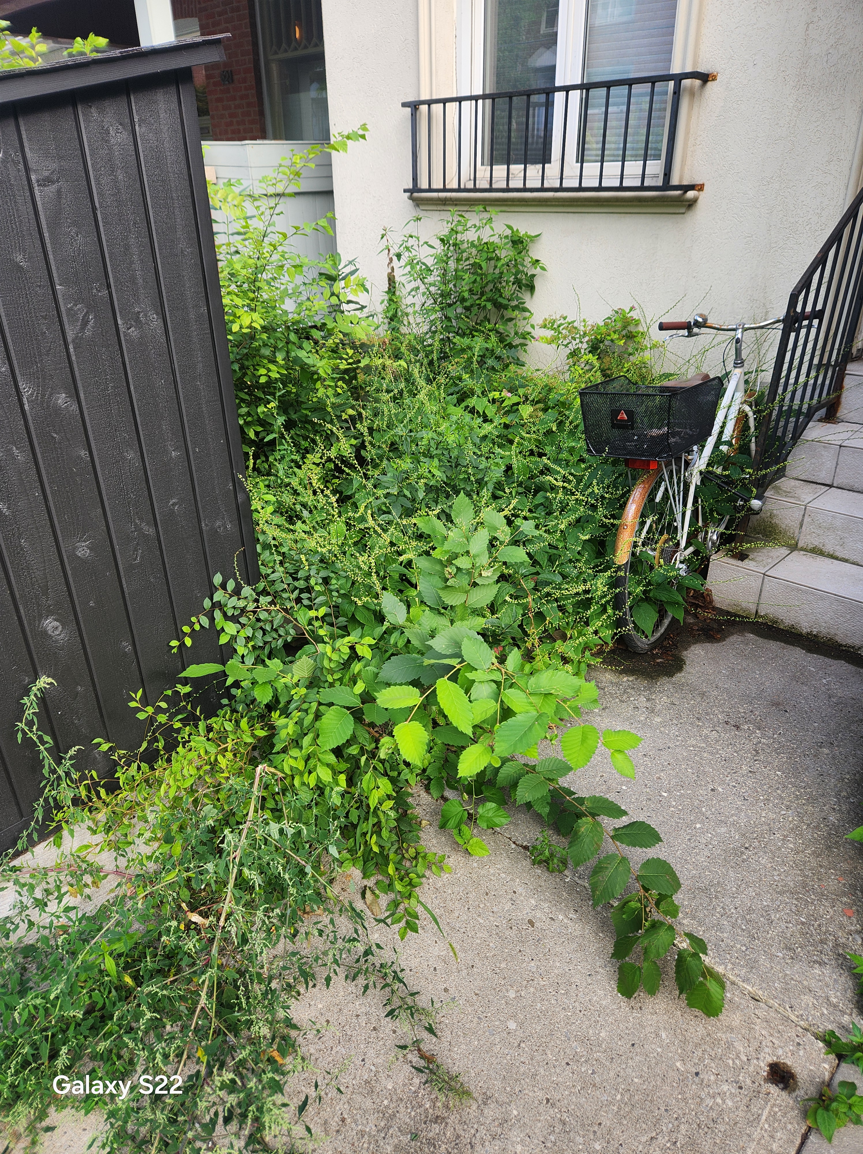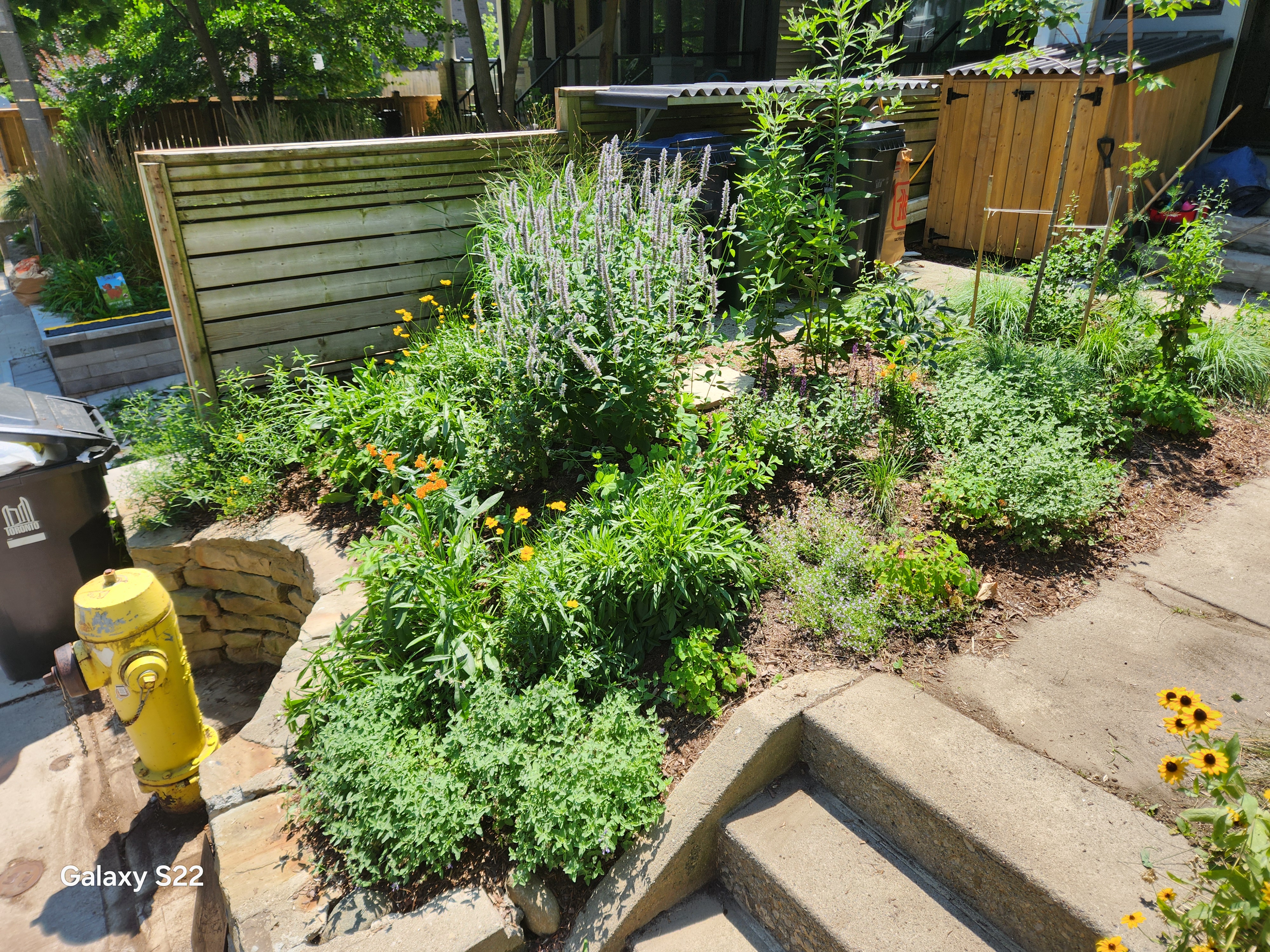 We solarized this East York front yard garden to remove thistle and english ivy. From the barren soil, we created a lush pollinator garden with 90% native plants. The second photo is only taken four months after the first, what a difference!