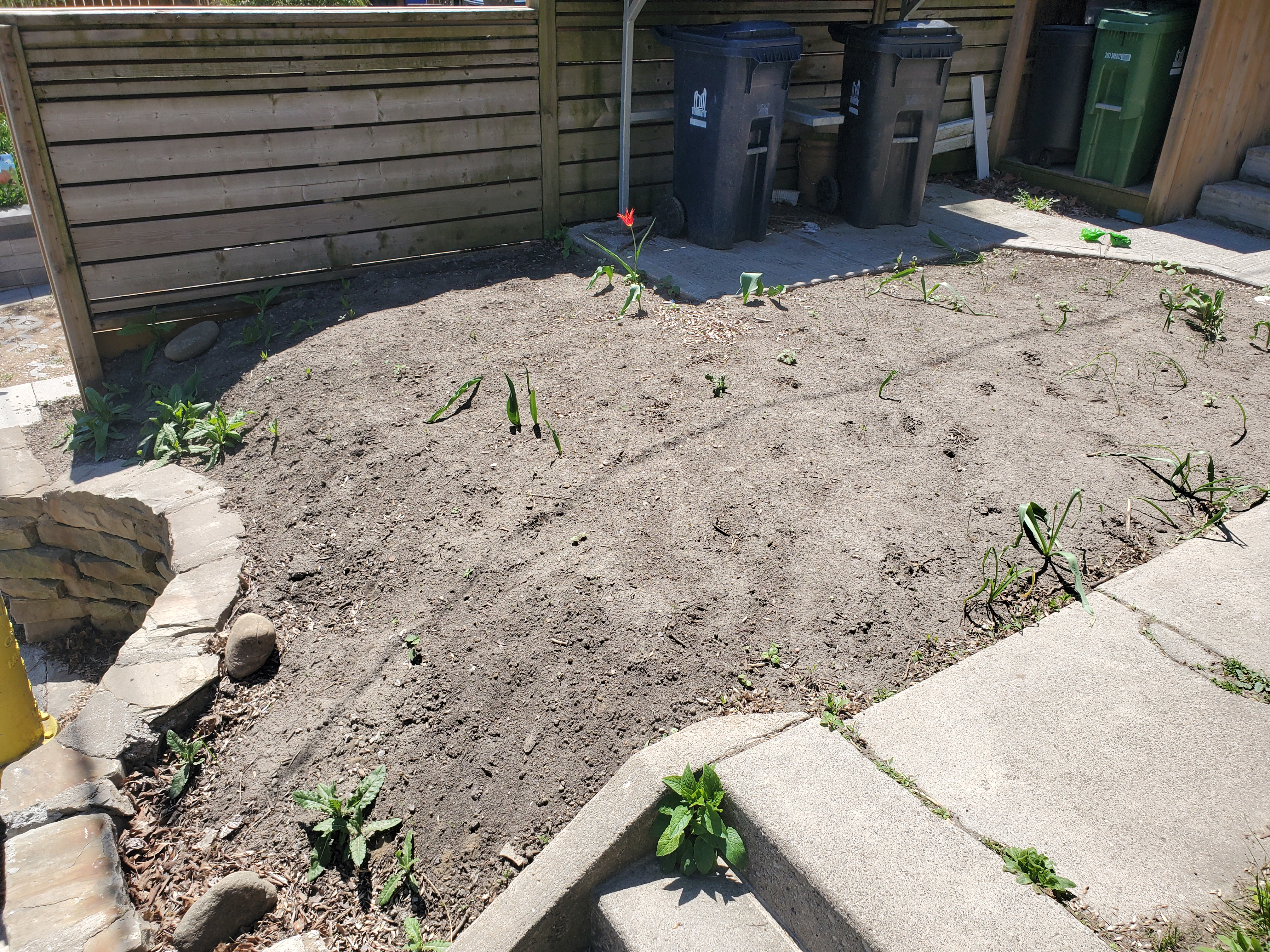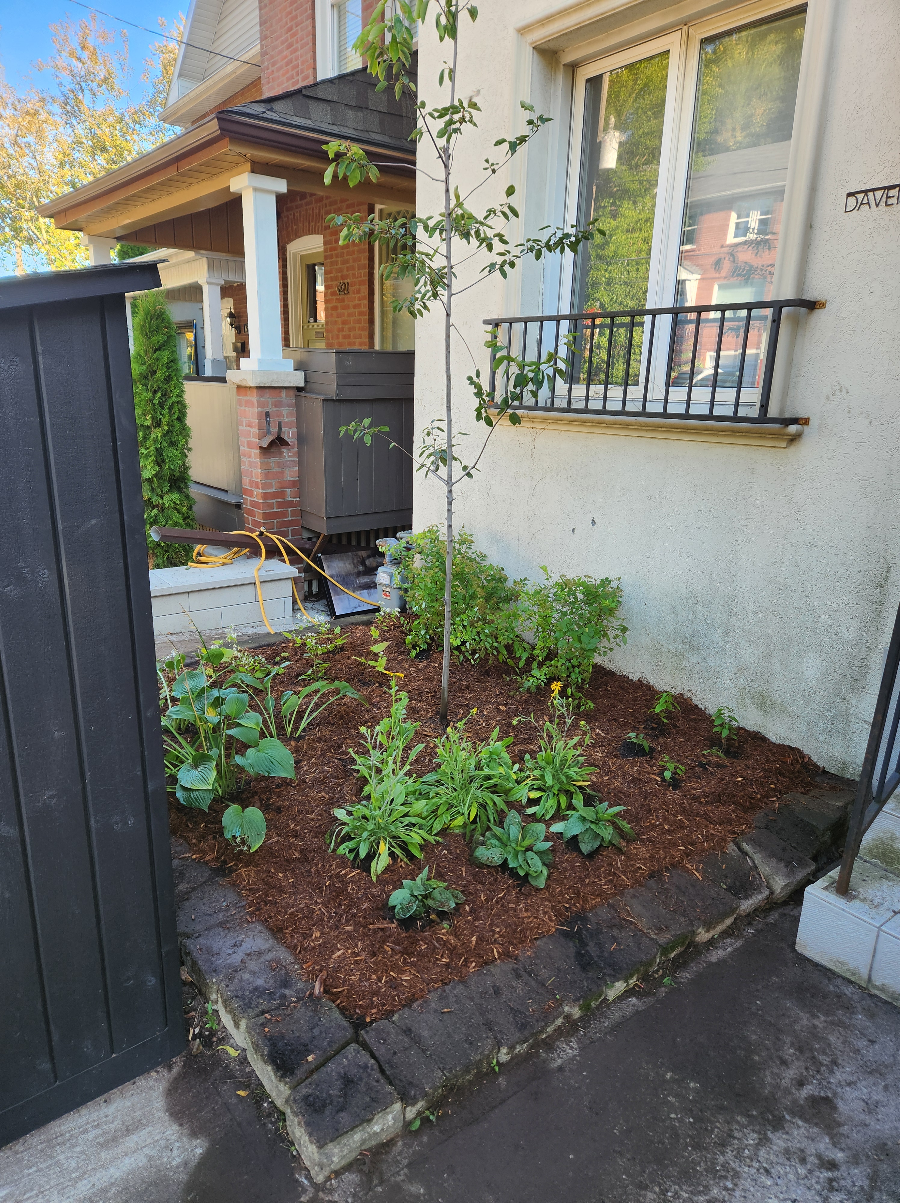 No garden is too small! This neglected little spot on a busy street got a full makeover. We removed all the weeds and an old stump, put in new soil and planted a serviceberry tree and some low-maintenance perennials. We were even able to save some hostas and spirea that were buried in the weeds and incorporated them into the design. Looking forward to seeing the yellow, white and purple blossoms this season.