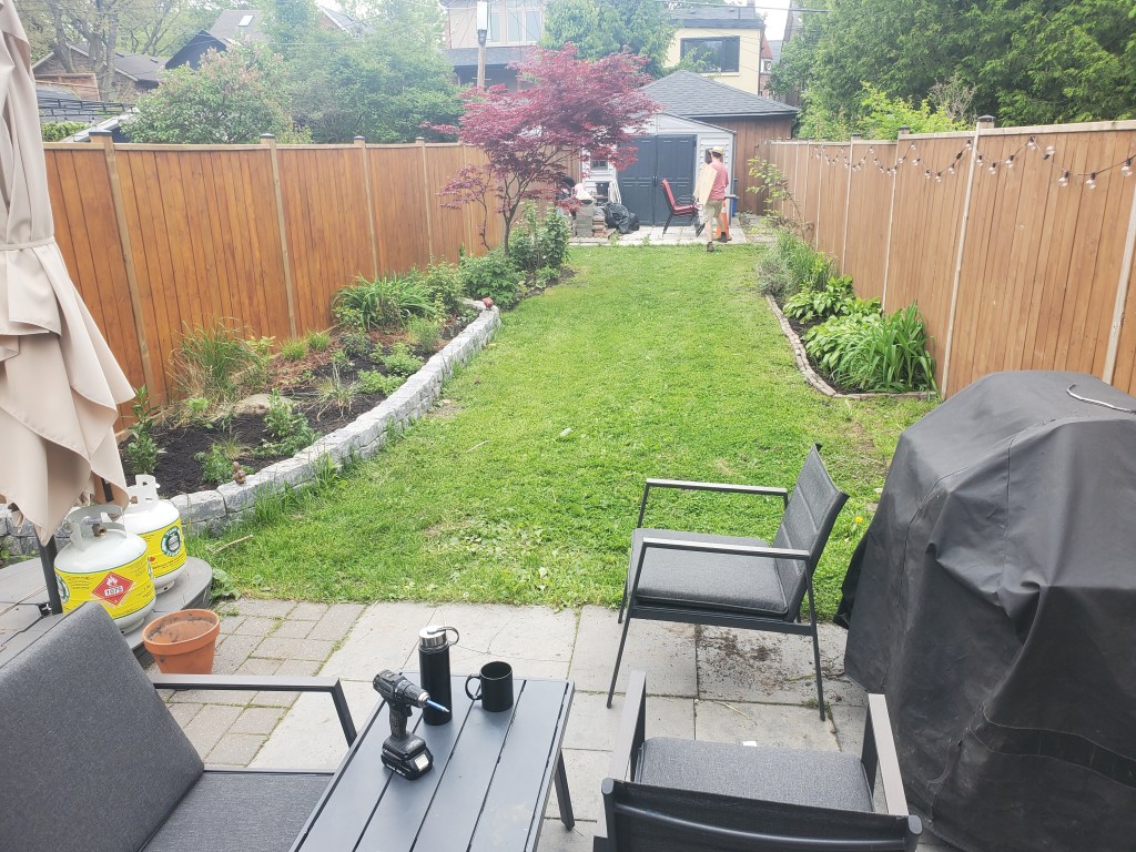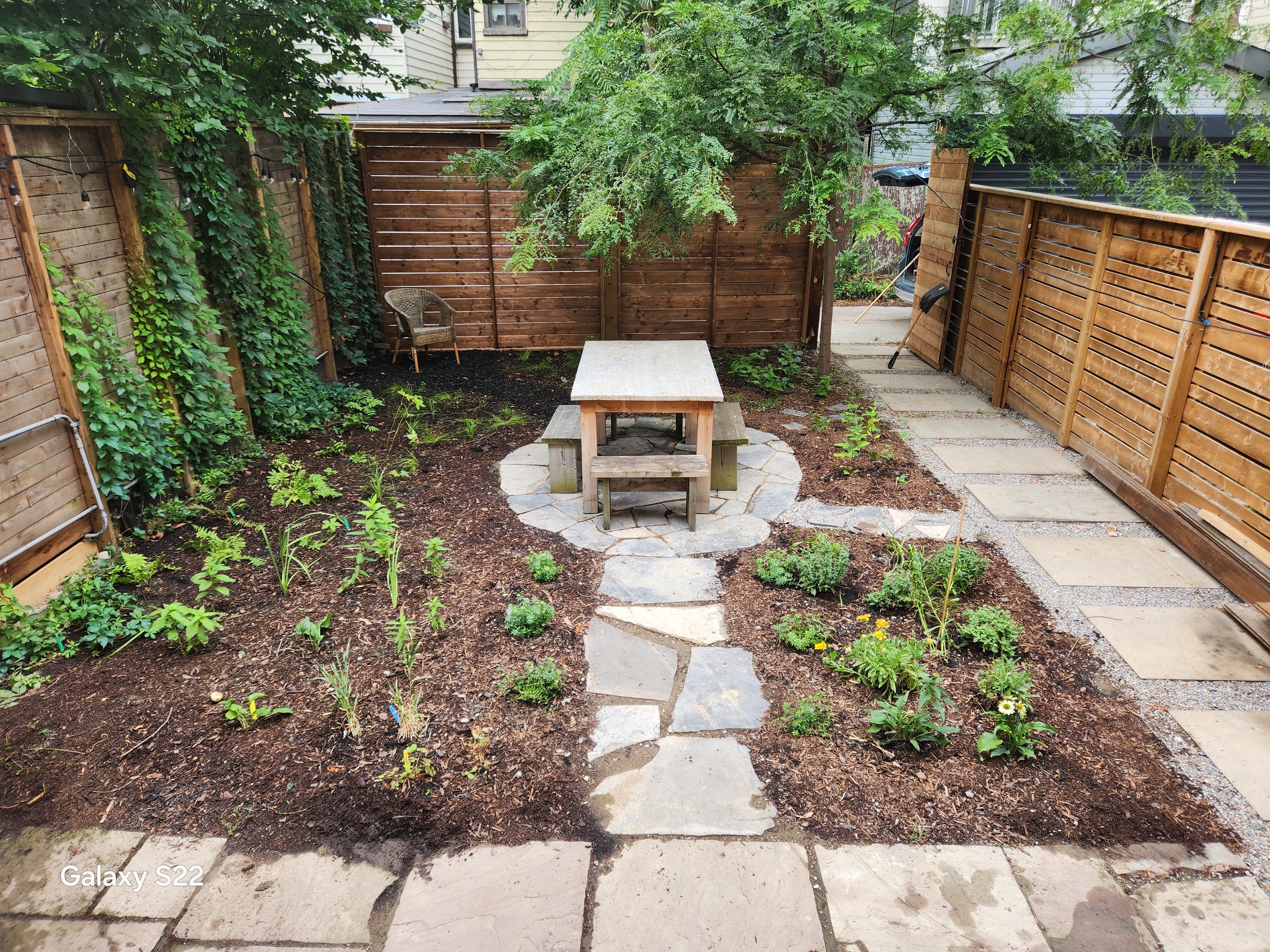 This was a post-construction garden rehabilitation in the Annex. The yard was compacted with construction fill and was hard as a rock. We aerated and amended the soil and planted a mix of native plants and showy flowering perennials. We also wooden fence for privacy and a random flagstone pad for evening dinners in the garden. The picture on the right was taken just after planting, looking forward to seeing how it fills in the next year or two.